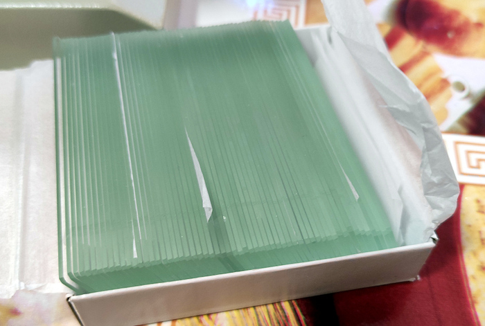 Отдельно в чемоданчике лежит ранее купленная в медтехнике пачка предметных стёкол, несколько штук уже ранее изговняли до состояния, что проще выкинуть чем отмывать.