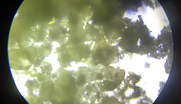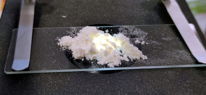 и как в оригинальном посте наблюдаю в проходящем свете - т.е. на просвет. Так как муки довольно толстый слой, то сбоку в качестве источника света поставил аккумуляторный прожектор - отлично светит.