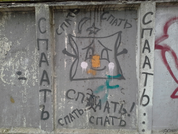 Yambert 10 лет назад Бог всех невысыпающихся Так и манит в свои объятия. P.S. Нашел в одном из московских дворов, район м.ВДНХ Подушка Спатьспатьспать Рисунок на стене