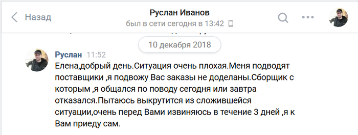 Он планировал приехать или послать установщика в выходные 10-11, 17-18, 24-25 ноября. 8-9 декабря. И всё никак у него не складывалось. И самое интересное, что где-то между выяснилось, что поставщик фасадов просто не сделал или не хочет отдавать Руслану наши фасады. Руслан заказал их в другом месте и ждет. И очень "извиняется передо мной в течение трёх дней" (извините, я не удержалась, когда увидела это сообщение):
