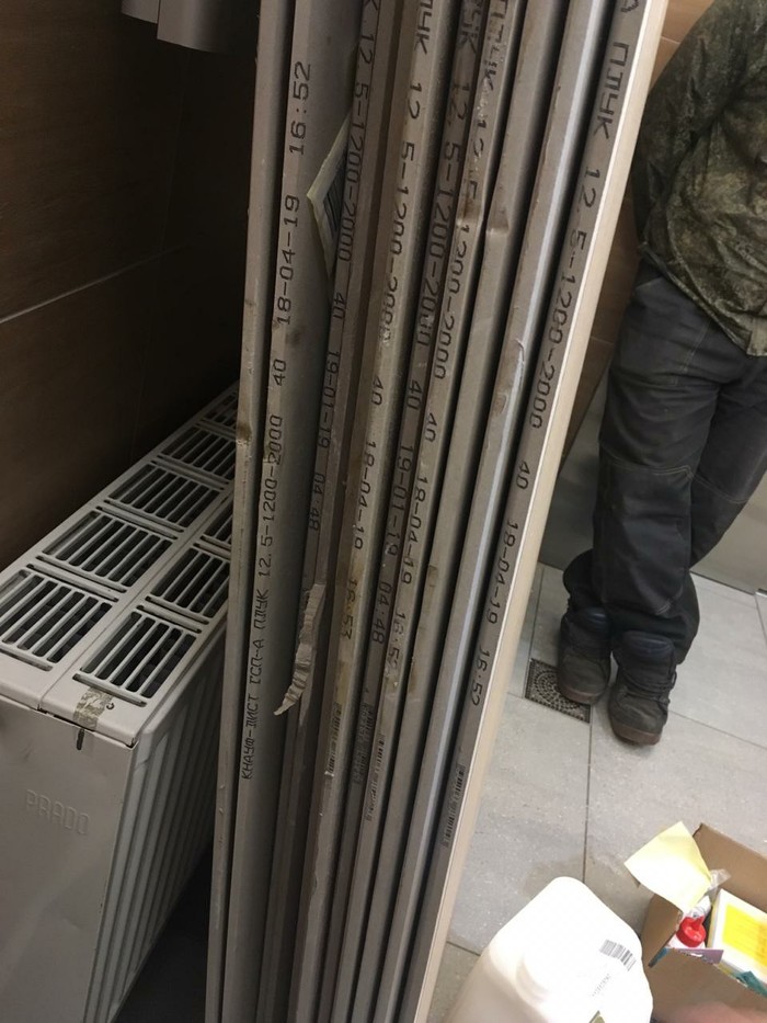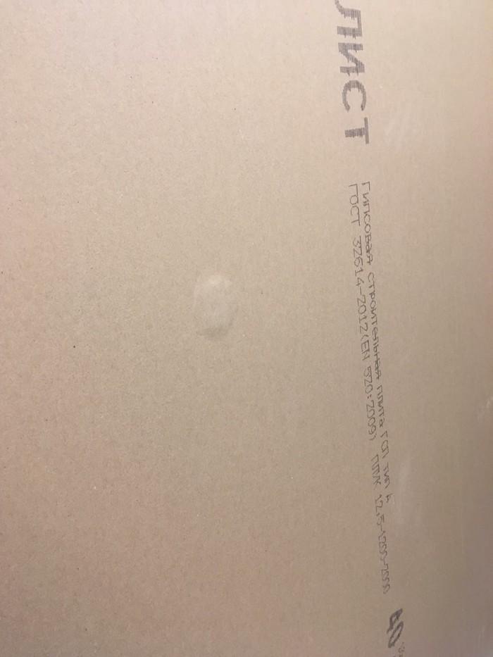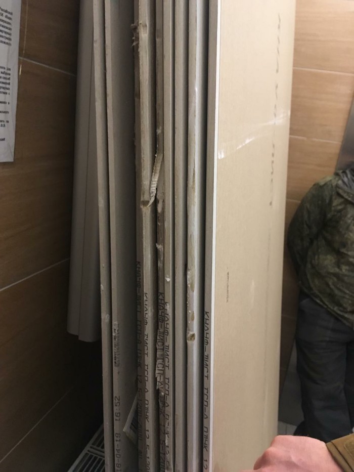 В 18-00 прибыли сотрудники доставки. При осмотре листов гипсокартона Knauf-Лист ГСП-А 2000х1200х12.5 мм были выявлены повреждения листов, включающие в себя: разбитые и содранные более 150 мм продольные кромки, многочисленные глубокие вмятины на продольных кромках на всех листах, вспученные поверхности картона на листах площадью 150 кв. см и более. Также при разговоре с экспедитором, был сделан вывод о несоблюдении требований по перевозке гипсокартона ГОСТ 32614-2012 (EN 520:2009), в соотв. с кот. изготовлены данные ГКЛ, в частности - перевозка листов стоя в автомобиле в вертикальном положении.