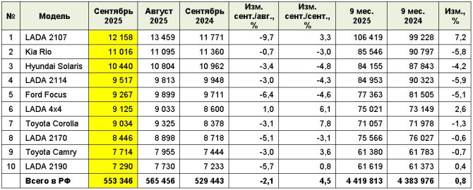 Согласно данным агентства «АВТОСТАТ», в сентябре 2025 года жители РФ приобрели 553,3 тыс. легковых автомобилей с пробегом. Это на 2,1% меньше, чем месяцем ранее (в августе – 565,5 тыс. шт.), но на 4,5% превышает результат сентября прошлого года (529,4 тыс. шт.).