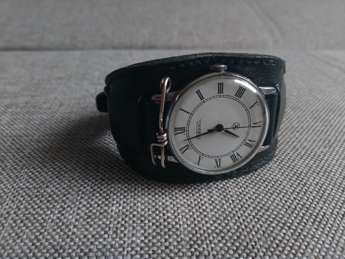 Часы "Ракета", выпущенные Петродворцовым часовым заводом. Булавка из серебра (не относится к эпохе СССР). Ремешок сшитый из двух.