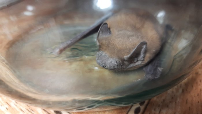 При беглом осмотре л.мышь внешне не пострадала, еще поорала немного, уже потише, уткнувшись мордой в коврик. Выловил, это было не сложно, она просто сидела, зацепившись за него когтями. Возможно не могла улететь потому что застряла в нем когтями, с трудом отделил ее. Посадил в 3л банку и напоил молоком, где-то слышал, что они его любят.