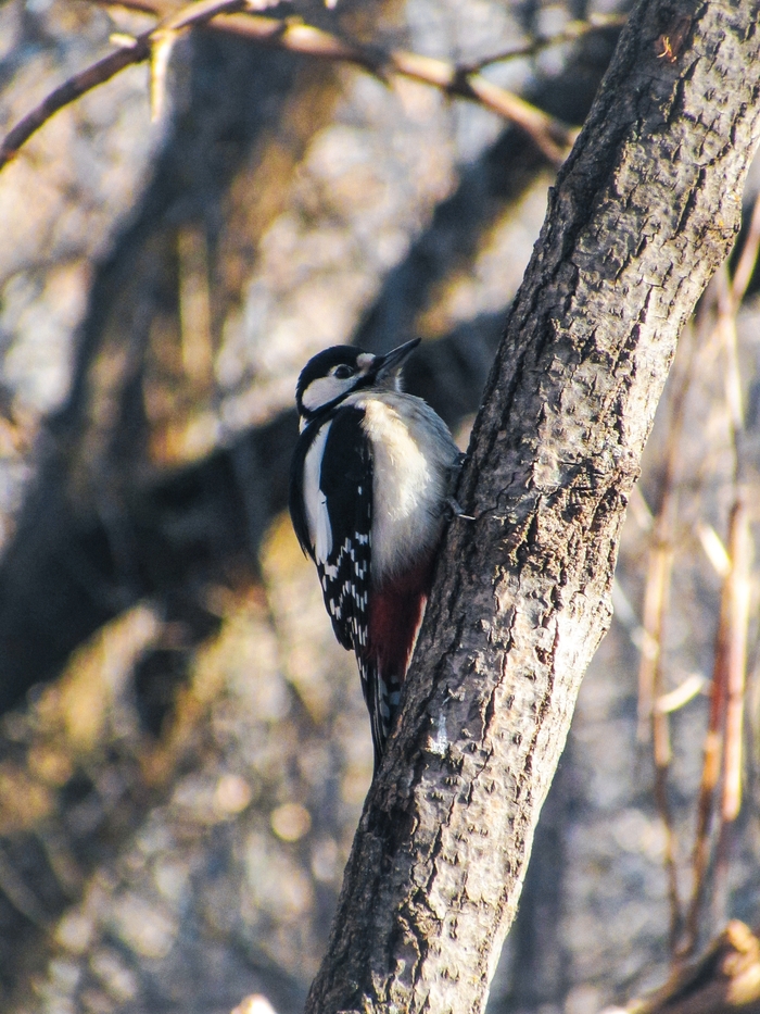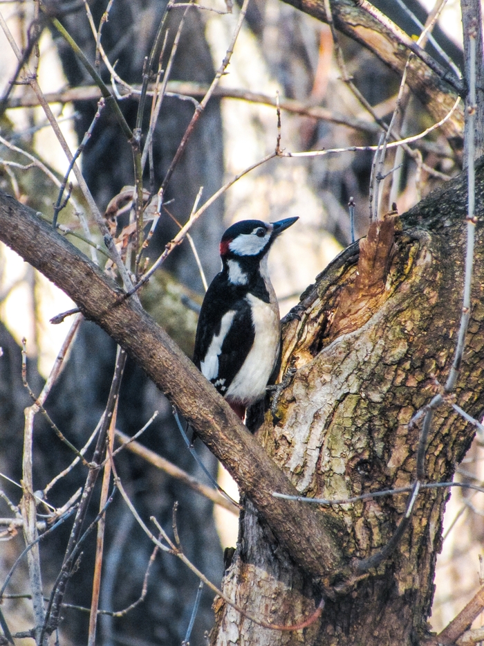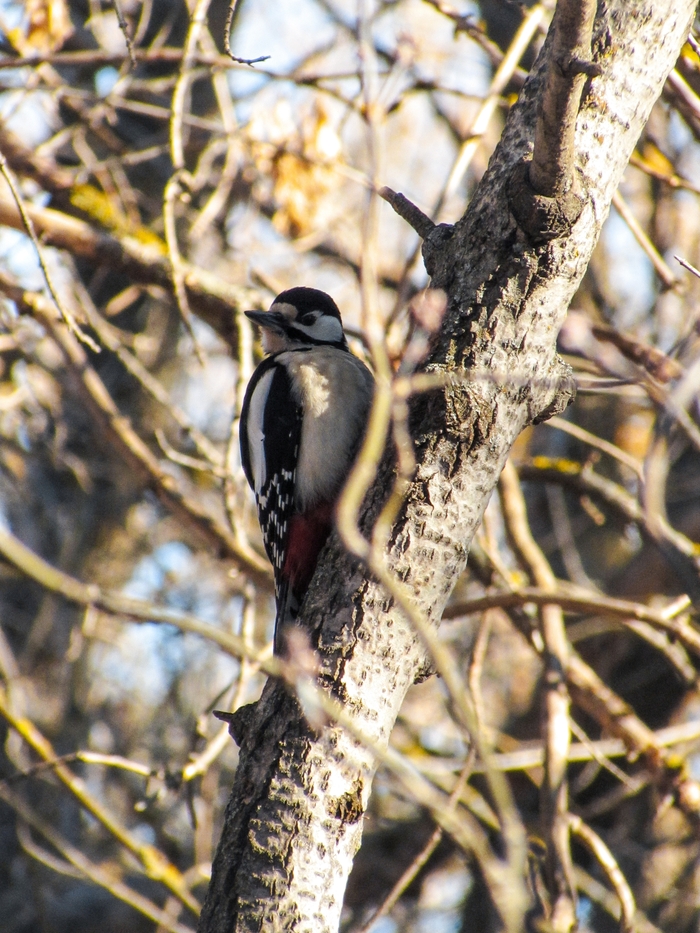 История о том, как дятел стащил семечки из кормушки, раздолбал их о дерево, нагадил и смотался.