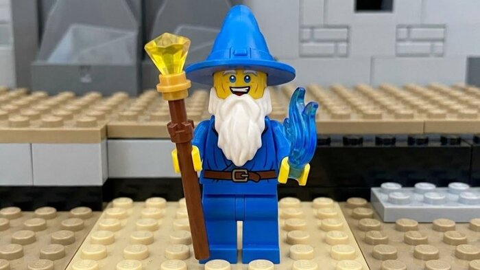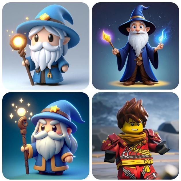 Сделать [объект] в LEGO-манере на базе прикрепленных картинок, передав модульность и узнаваемые крепления, персонажа, одежду и аксессуары взять с первых трех картинок, стиль как на последней.
