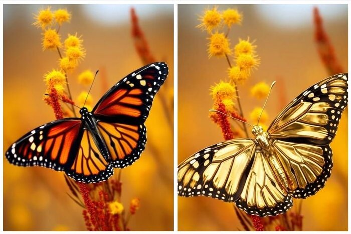 Преобразовать бабочку в золотую, добавить зеркальный блеск и сохранить мельчайшие природные особенности.