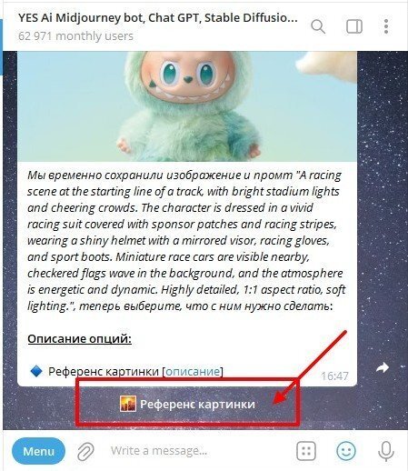 Кликаем "Референс картинки". Сервис соединит промт с картинкой, и вы получите уникальный результат.