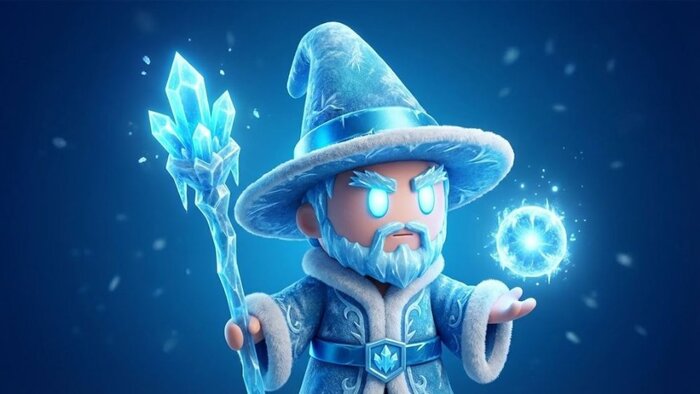Сформировать ледяного прорицателя по мотивам мага. Сохраняются его пропорции и художественные особенности. Добавить морозные узоры, полупрозрачные ткани и сияние глаз голубого цвета. Фон — синий переход.