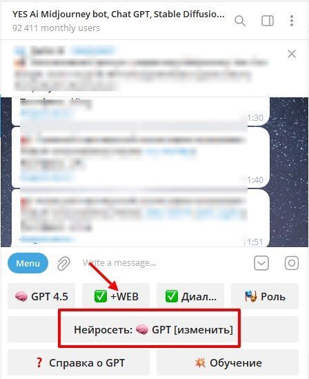 1. Заходим Yes Ai Bot, где уже встроен ChatGPT. В меню выбираем "ChatGPT" и активируем опцию "+WEB", чтобы модель могла выходить в интернет.