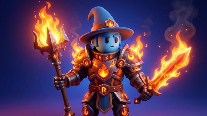Создать воина пламени по мотивам мага. Сохранить изначальные особенности образа: телосложение, стиль штриха и подбор цветов. Включить огненные знаки, массивные доспехи и интенсивное теплое свечение. Фон — плавный синий переход.
