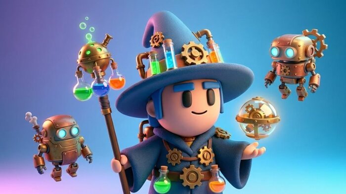 Сгенерировать техно-алхимика, вдохновленного образом мага. Сохранить пропорции, фактуру и цветовую гамму. Включить алхимические сосуды, детали из латуни и маленького механического помощника. Фон — синий переход.