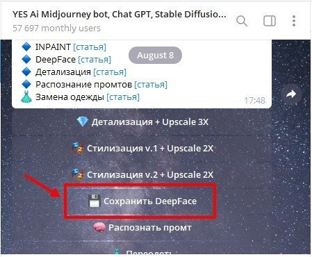Заметьте: функция "Сохранить DeepFace" появляется только при активированной нейросети Stable Diffusion в боте.