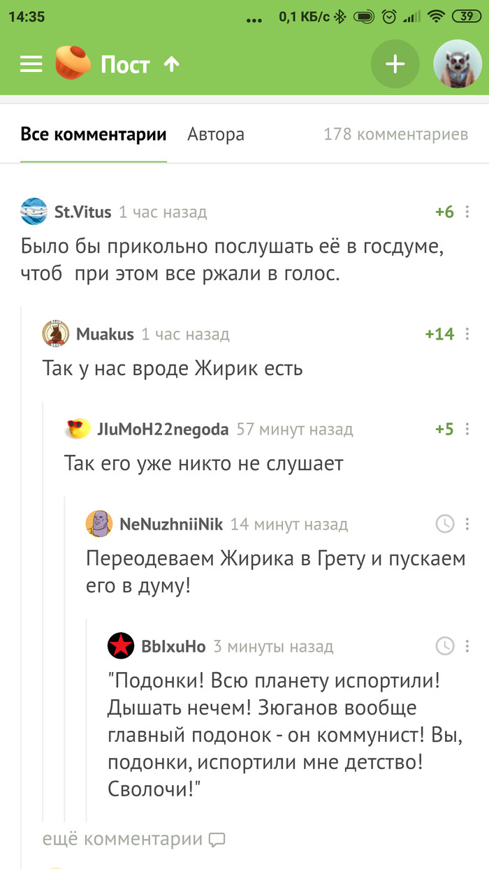 983 Yeti93 Скриншоты комментов Владимир Вольфович Тунберг 6 лет назад #comment_150966514 Показать полностью 1 Грета Тунберг Владимир Жириновский Скриншот Комментарии Комментарии на Пикабу