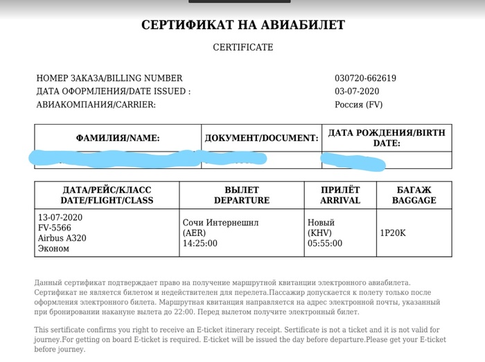 А вместо билета до Хабаровска, пришел вот такой сертификат, где написано что до 22-00, но прошло 3 дня и ни слуху о маршрутной квитанции.