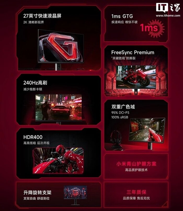 Redmi G27Q 240Hz оснащён Fast IPS-панелью с разрешением QHD (2560×1440) и частотой обновления 240 Гц. Монитор поддерживает AMD FreeSync Premium, что обеспечивает плавный геймплей без разрывов.