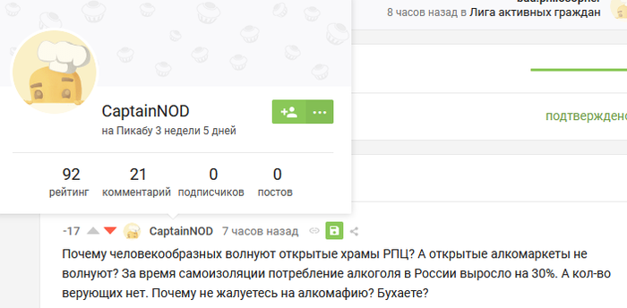 Так же очередной свежий аккаунт, активно топящий за оправдание церкви в постах и комментариях.