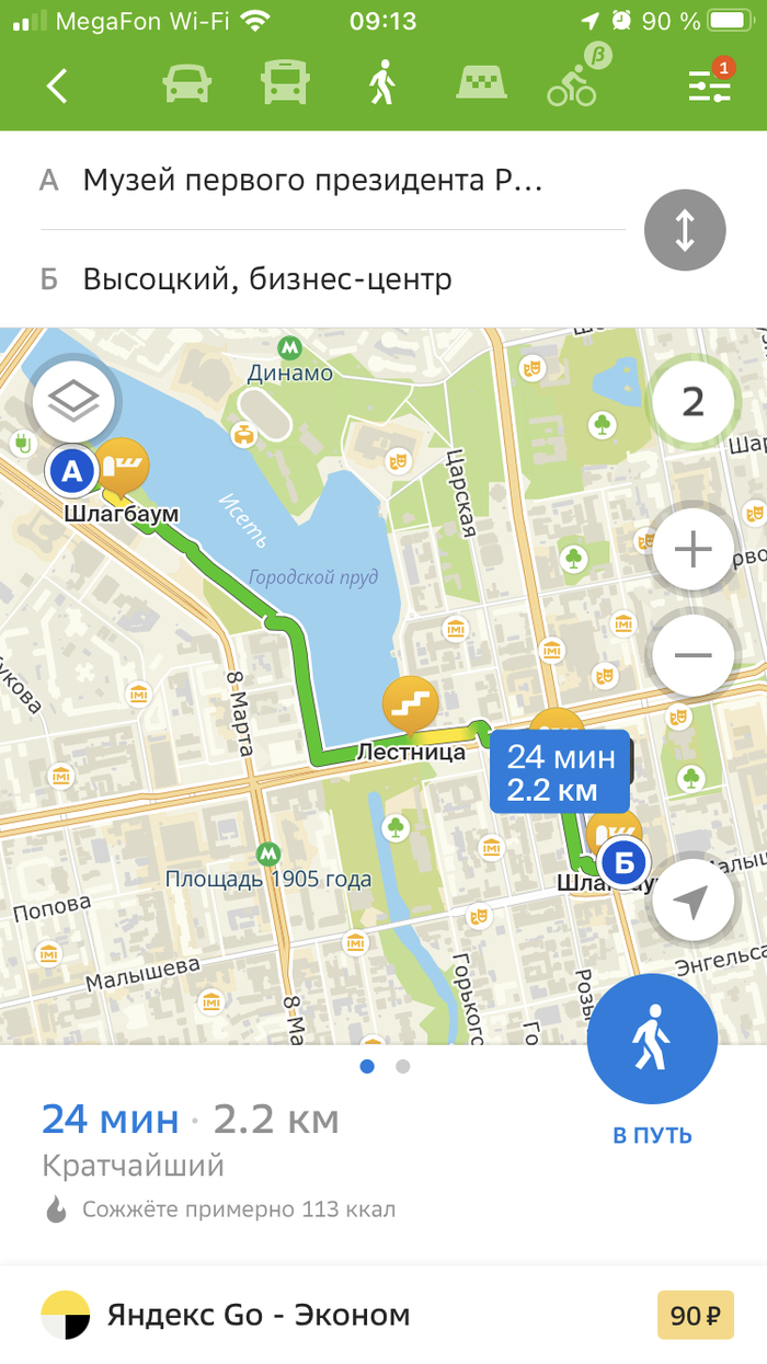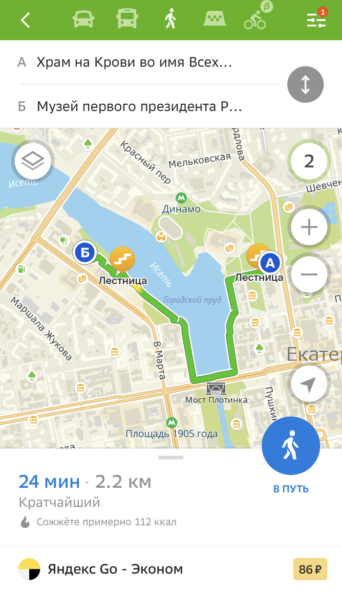 На арендных самокатах (150-250₽) или такси(90-500₽) или пешком