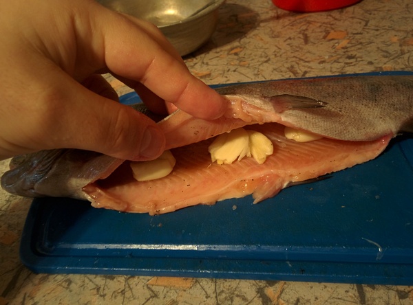 столовая ложка соли(крупной, а лучше морской) обтираем форель с двух сторон и внутри, после также поступаем с оливковым маслом(2 ст. ложки), 2 головки чеснока кладем внутрь рыбы предварительно придавив плоскостью ножа (не делайте большой разрез как я, иначе чеснок будет выпадать) и щипотку черного перца также с двух сторон