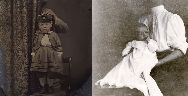 Второй самый популярный способ — детей держали на руках их собственные матери, которых пытались сделать максимально незаметными на фото: накрывали коврами, тряпками, одеялами, чтобы дамы сливались по цвету с фоном. Женщин прятали за ширмой, бывало — вырезали из кадра (тогда на фото оставались лишь висящие в воздухе жутковатые бестелесные руки, держащие ребенка). Иногда лица матерей, которых не удалось накрыть фоном полностью, запечатывались или выцарапывались при печати, и оказывалось, что вместо головы у них — черная дыра. Некоторые мамы прятались под софой и высовывали руки оттуда, кто-то закрывался волосами, как шторой, другие ловко маскировали верхнюю часть тела, но забывали про ноги. Выходило не всегда удачно, но почти всегда смешно и очень странно.