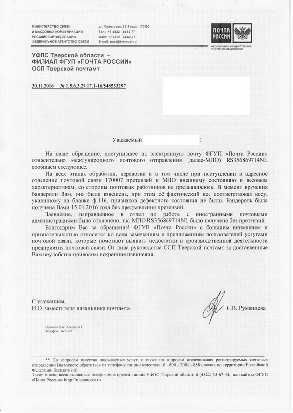 По прошествии почти года и неоднократных переписок с ПР, получил уже, видимо, окончательный ответ. Пошёл, типа, нах, с Новым годом. А, собственно, всё, что я просил в заявлениях, пояснить мне, почему ПР приняла на границе посылку с недостачей 20% веса. Никаких компенсаций я не просил.