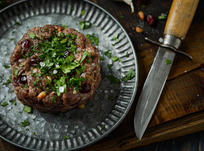 Сразу после быстрого обжаривания нарезать мясо мелким кубиком. Добавить к нему ложку оливкового масла, вустерский соус, подмариновавшийся лук вместе с бальзамическим уксусом, клюкву, орешки. Посолить и поперчить по вкусу. Хорошо вымесить и убрать в холодильник на час-полтора, чтобы тартар хорошо охладился.