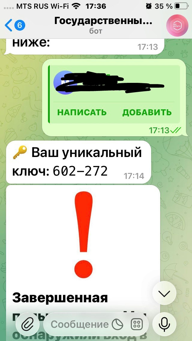 Не дозвонившись до жертвы, мошенники поудаляли чаты. Но бот остался, так что если интересно, можете глянуть тут. Ну и пожаловаться на него, естесссссссно. Возможно, если придет не одна жалоба, а сто одна, пашины админы таки почешут жопу и хотя бы удалят его, а мошенникам придется мастырить нового.
