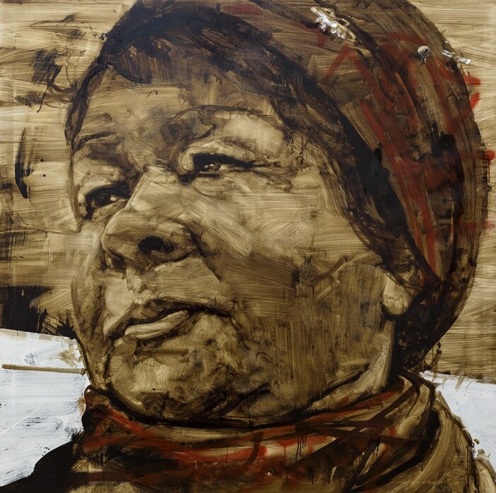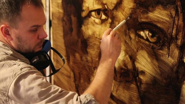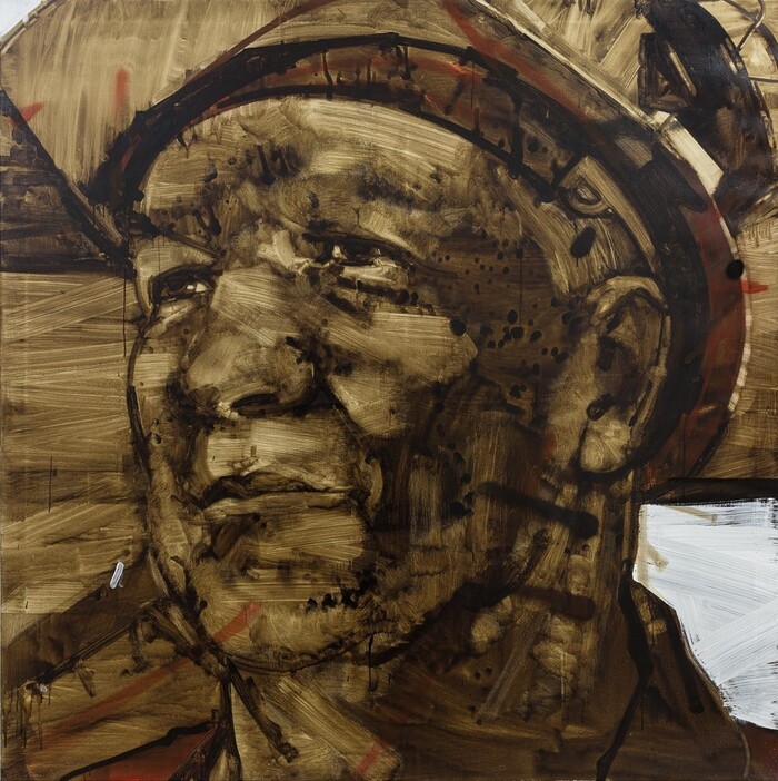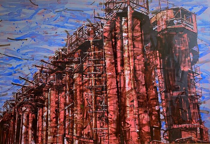 Илья Гапонов. Холст, кузбасслак, иногда акрил. На телефоне не очень понятно, но картины огромные: