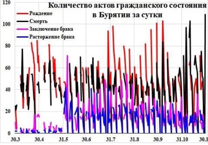 Еще не все субъекты РФ опубликовали данные ЗАГСов за ноябрь-2020, но вот, к примеру, сведения из республики Бурятия. Бурятия, единственный регион, который публикует посуточную статистику актов о рождениях и смертях. Рождений 979 (-1,6% к АППГ, с учётом ухудшения возрастной структуры рост рождаемости примерно на 1%) Смертей 1344 (+54,8%).