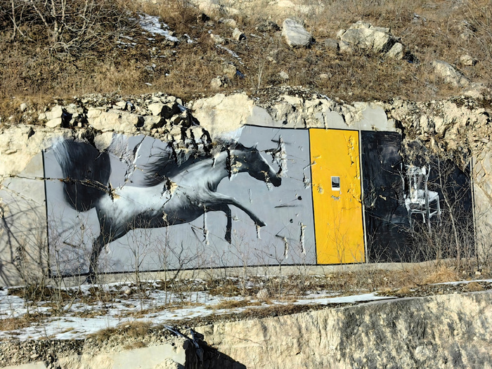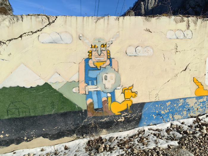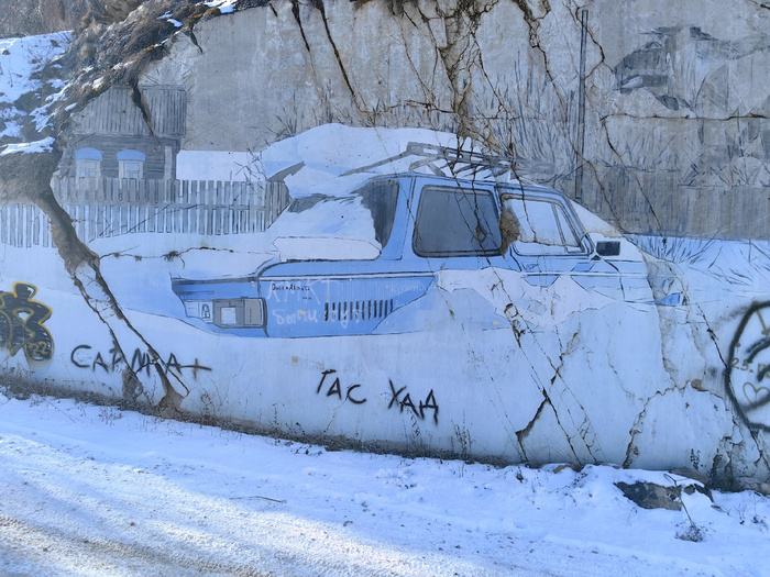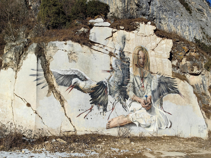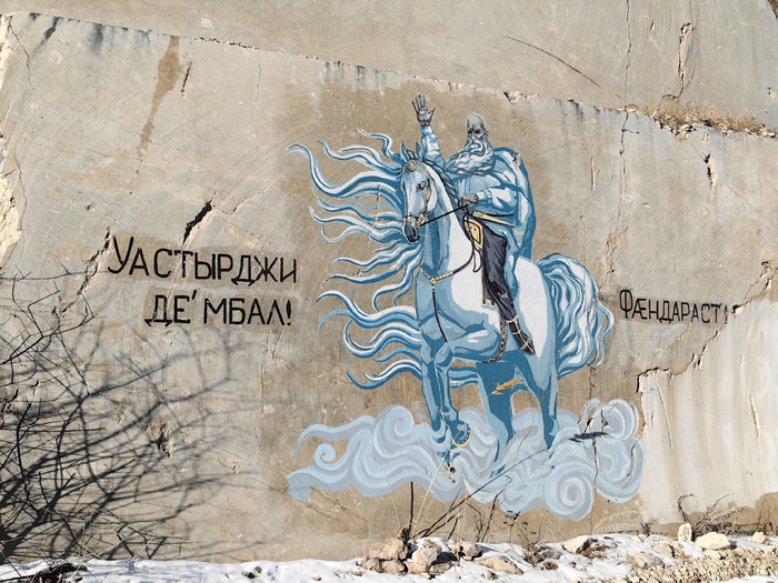 Скалы перевала Кахтисар теперь украшают: девушка с аистами, люди с домами вместо головы, даже голубой запорожец в сугробе. К этому проекту приложили руку: дуэт уличных художников Ильи Ис и Артема Бурж из HoodGraff, а с ними Стас Багс, Костя Ужве, Миша Верт. Всего, как я уже сказал выше, 10 граффитчиков из стран СНГ и столько же работ, пропитанных уникальной национальной культурой.