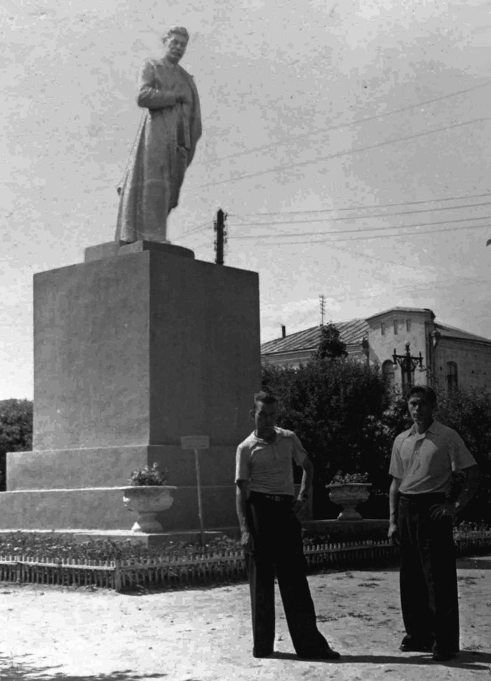 Памятник Сталину в городском саду, 1954 год. Строение на заднем плане — Дворец пионеров, который уже через 4 года переедет в новое здание на Челюскинцев. Фото С.М. Палкина.