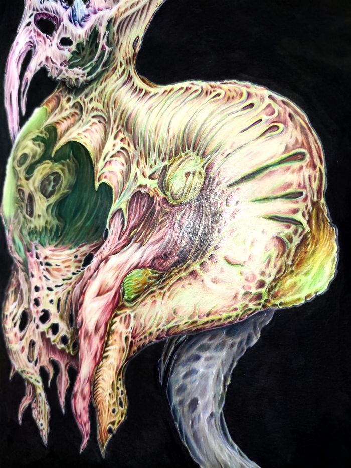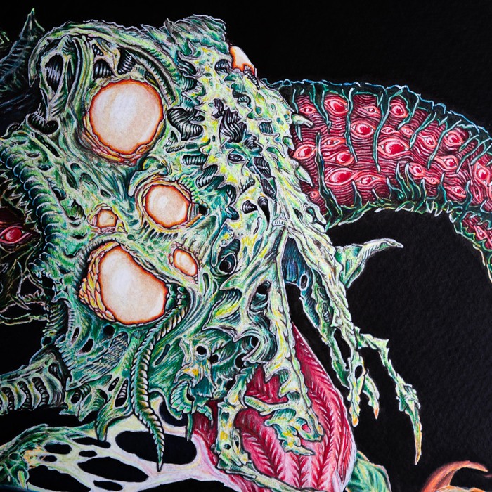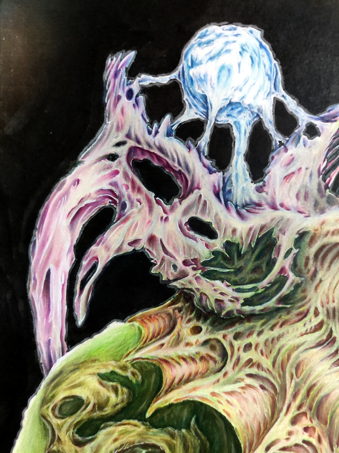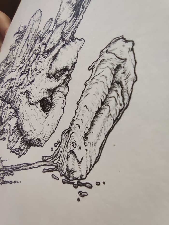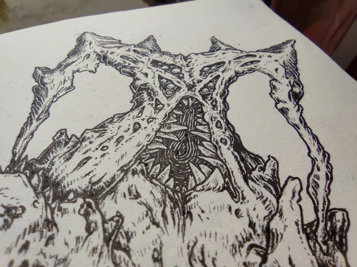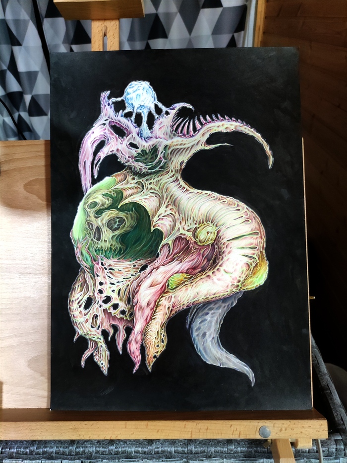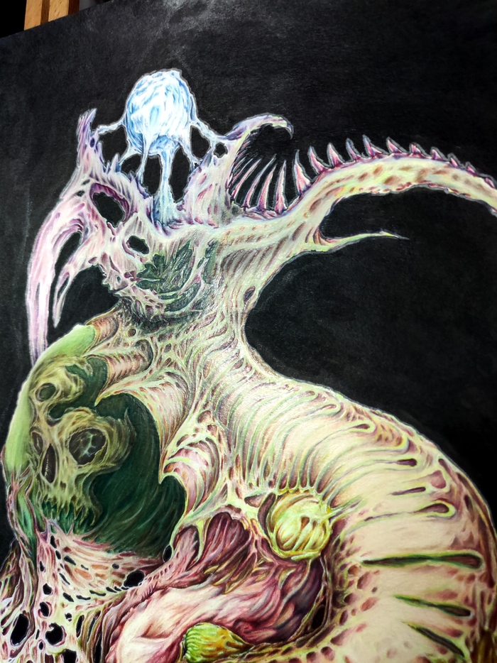 По моей задумке, которая менялась 30 раз в процессе, некое магическое существо с короной из левитирующих камней обладает силой контроля рун. Руны используются для поддержания сил необходимых для создания рук способных удержать куб. Куб обладает некой мощью, которая является аналогом чёрных дыр(в моём понимании), он может поглащать, он может искажать и может рвать всё, ну, практически. В рисунке это отражено путём разрыва черепа, поглощения черепа, разрыва червя. Червь. Он является основой, стержнем, пищей магическому сущетсву, он и есть в целом это существо.