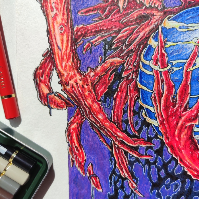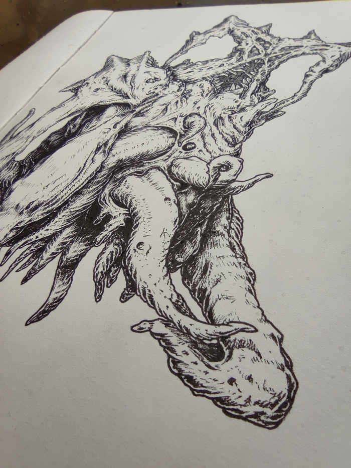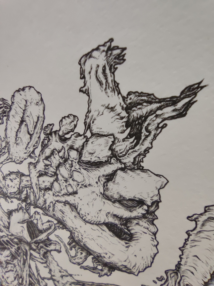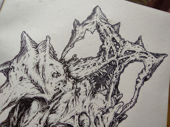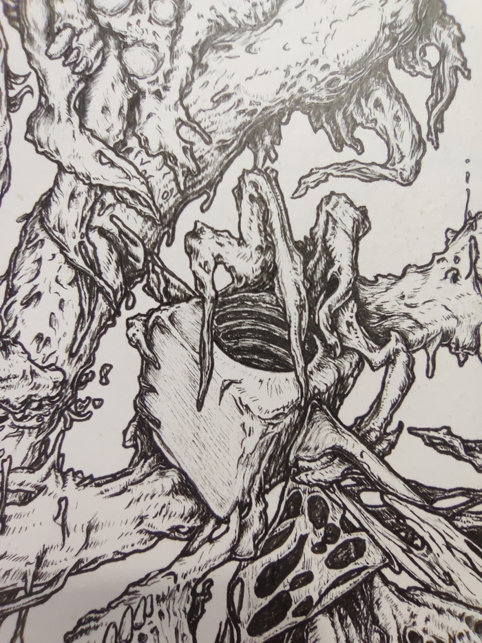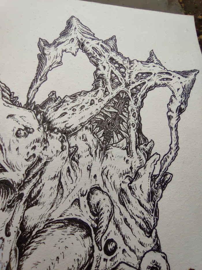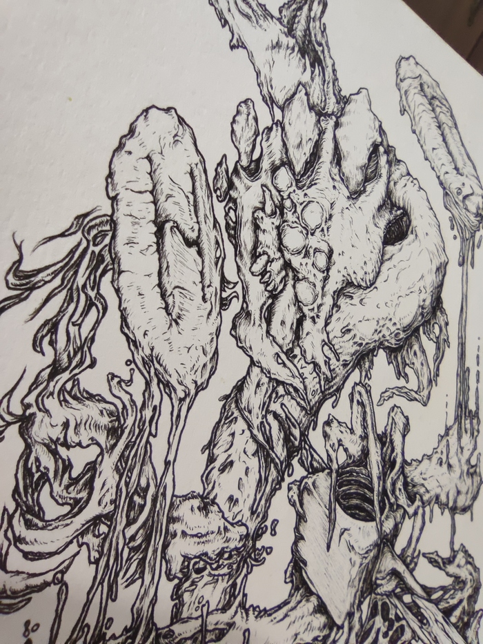 По моей задумке, которая менялась 30 раз в процессе, некое магическое существо с короной из левитирующих камней обладает силой контроля рун. Руны используются для поддержания сил необходимых для создания рук способных удержать куб. Куб обладает некой мощью, которая является аналогом чёрных дыр(в моём понимании), он может поглащать, он может искажать и может рвать всё, ну, практически. В рисунке это отражено путём разрыва черепа, поглощения черепа, разрыва червя. Червь. Он является основой, стержнем, пищей магическому сущетсву, он и есть в целом это существо.
