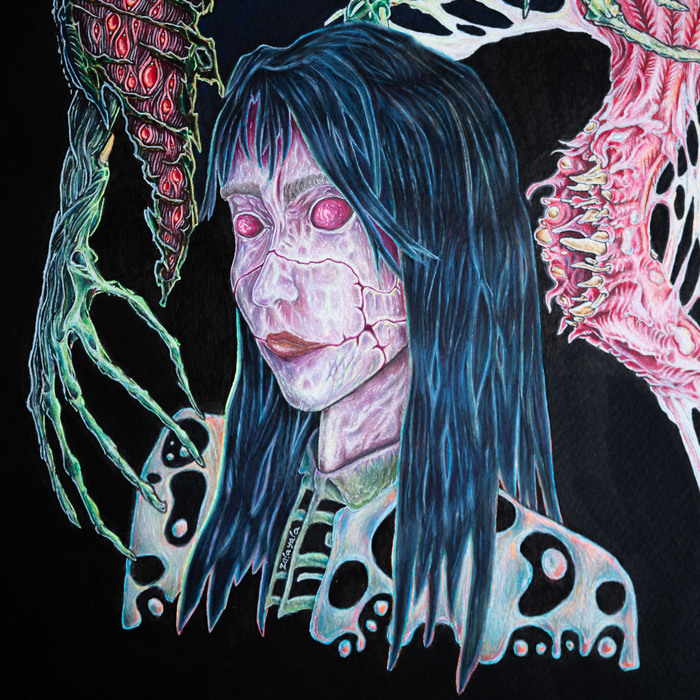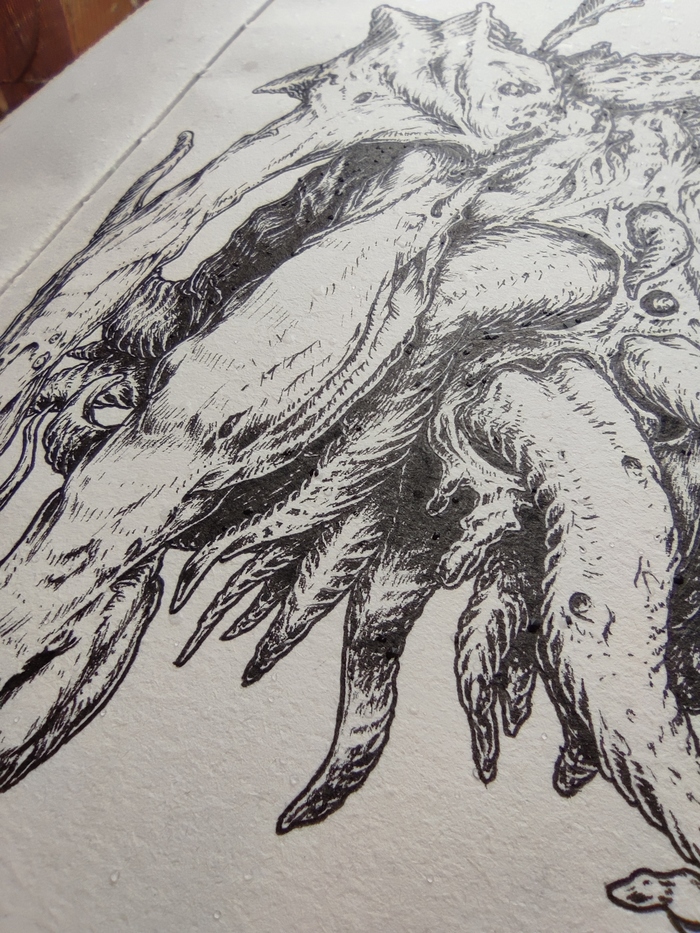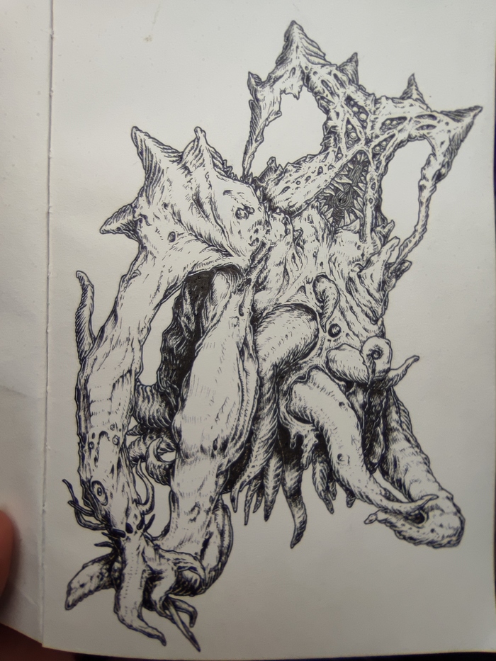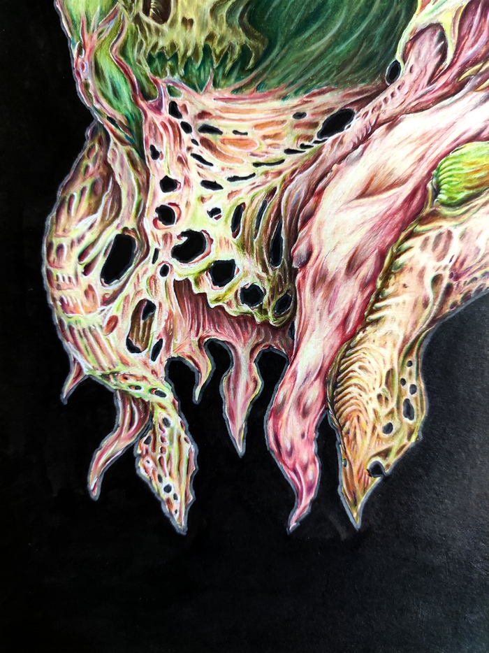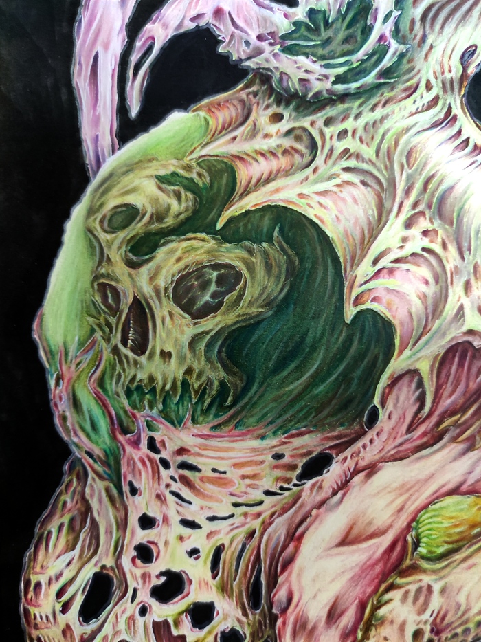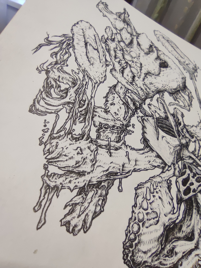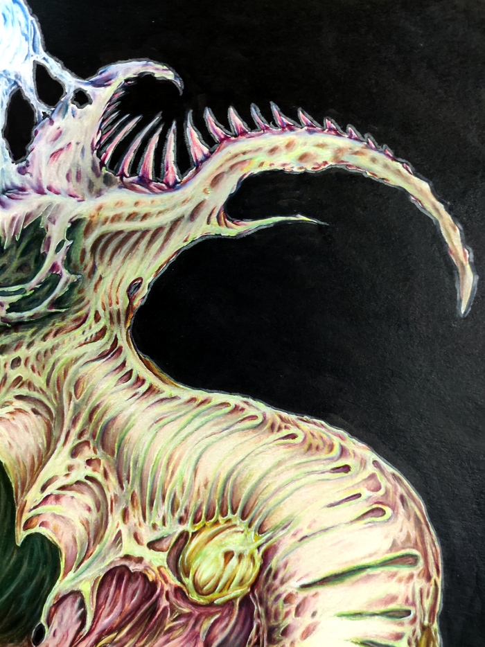 По моей задумке, которая менялась 30 раз в процессе, некое магическое существо с короной из левитирующих камней обладает силой контроля рун. Руны используются для поддержания сил необходимых для создания рук способных удержать куб. Куб обладает некой мощью, которая является аналогом чёрных дыр(в моём понимании), он может поглащать, он может искажать и может рвать всё, ну, практически. В рисунке это отражено путём разрыва черепа, поглощения черепа, разрыва червя. Червь. Он является основой, стержнем, пищей магическому сущетсву, он и есть в целом это существо.