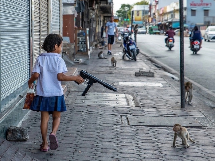 Натолкнулся на новость, которая меня очень повеселила - в Тайланде проблема с дикими обезьянами дошла до того, что люди закупают страйкбольные и пневматические стволы, чтобы от них отбиваться. А обезьяны научились отбирать стволы у детей, ограбили торговый центр, нападали на полицейский участок, пока полиция от них баррикадировалась.