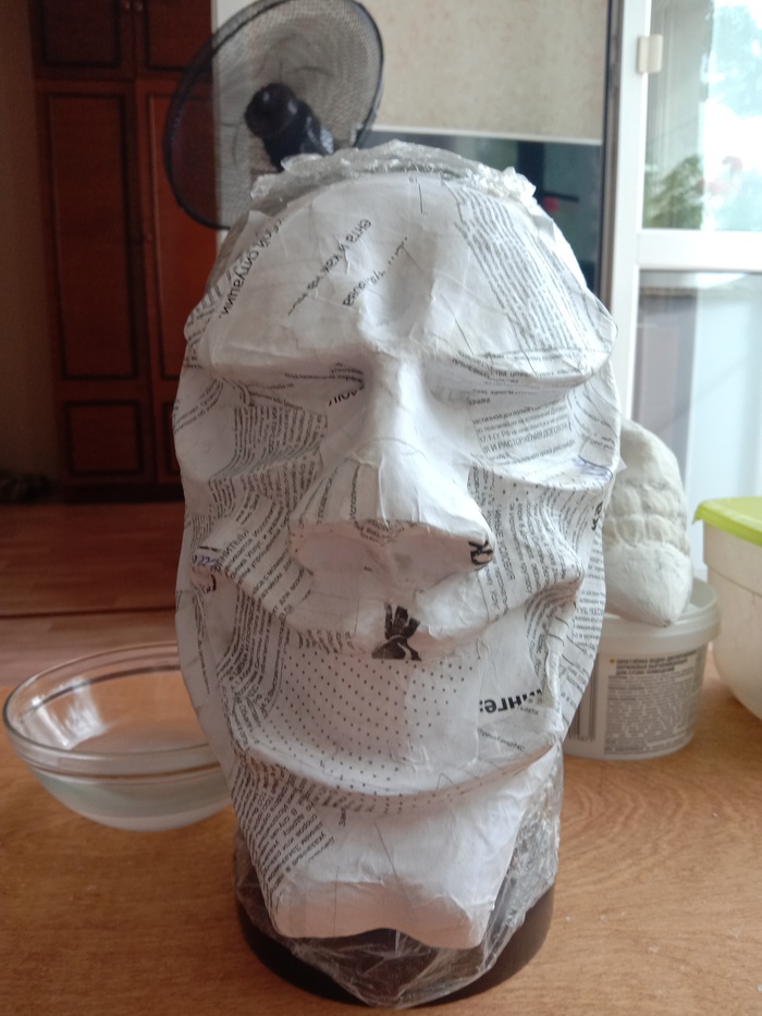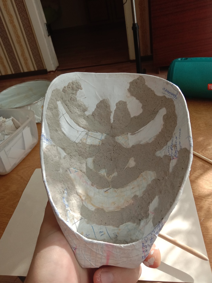 Рога и зубы для полноты картины, делал их отдельно. Как с формой закончил, облепил клочками бумаги послойно чередуя тетрадные листы и офисную бумагу