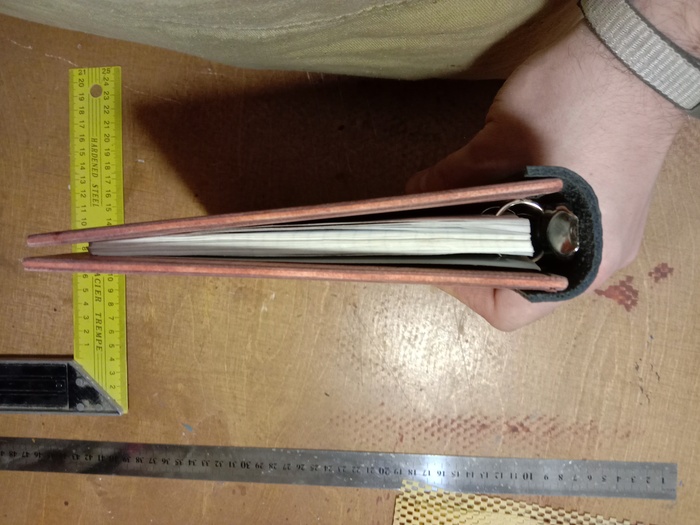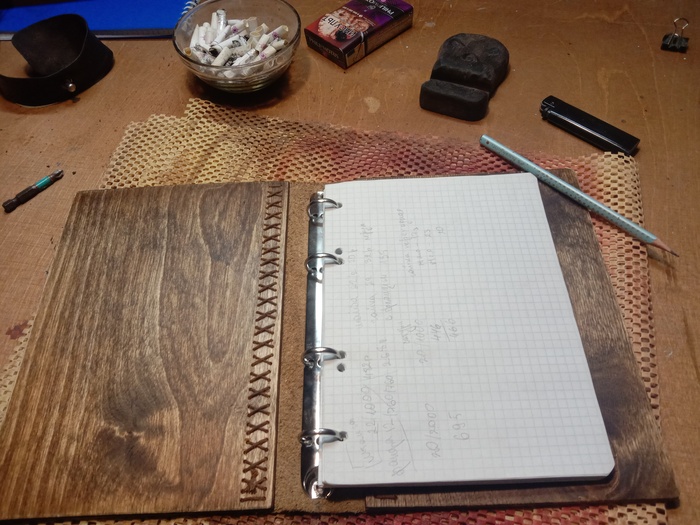Давно тут ничего не выкладывал, решил напомнить о себе) Соорудил блокнот из подручных средств. Фанера, кожа и механизм были, купил только шнур вощёный. Рисунок переносил выжигателем сам) Морилка и финиш масловоск) Сильно не пинайте, знаю что криво и косо, но делал для себя сугубо интереса ради) Удобная штука вышла, я вам скажу)