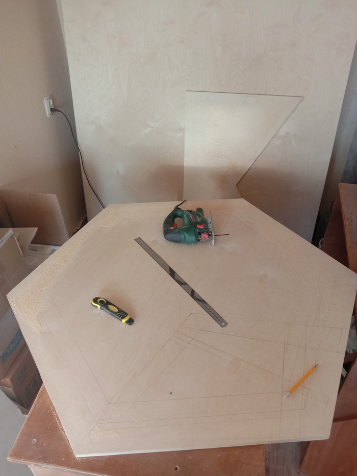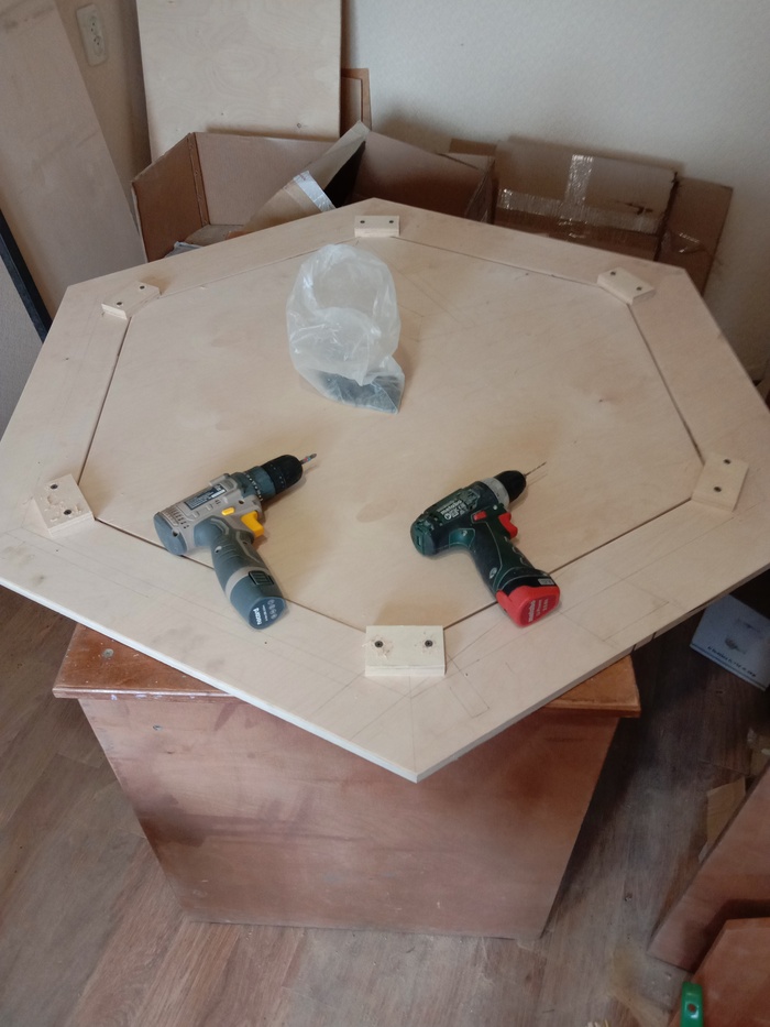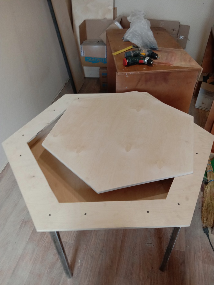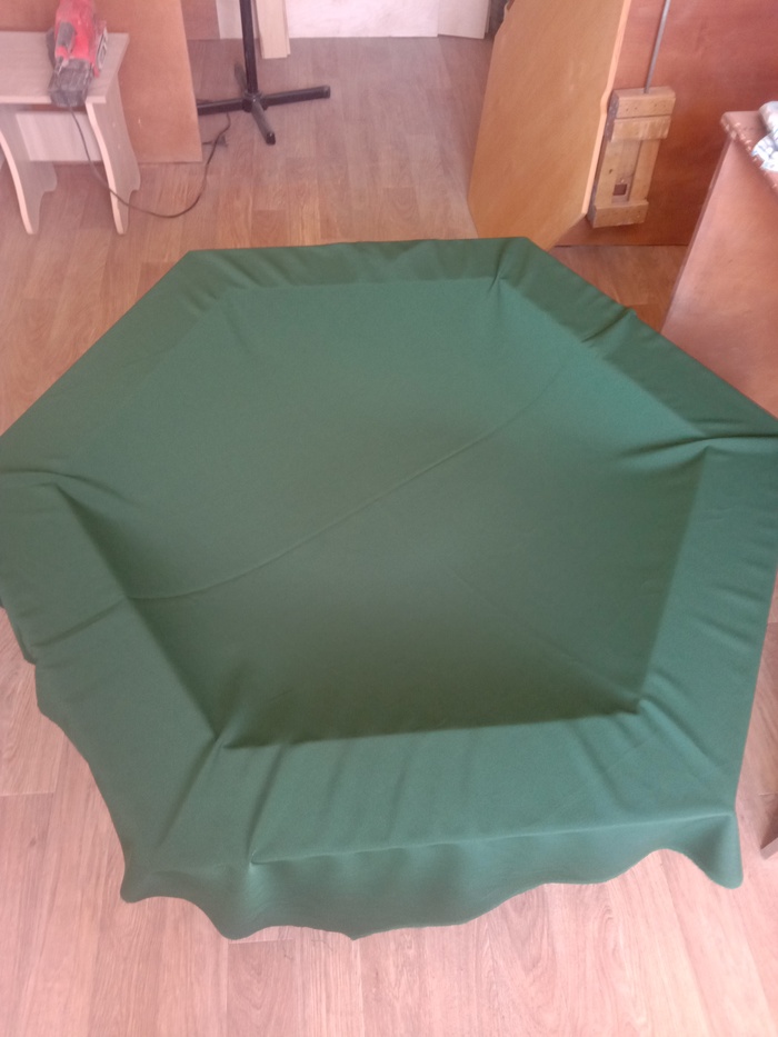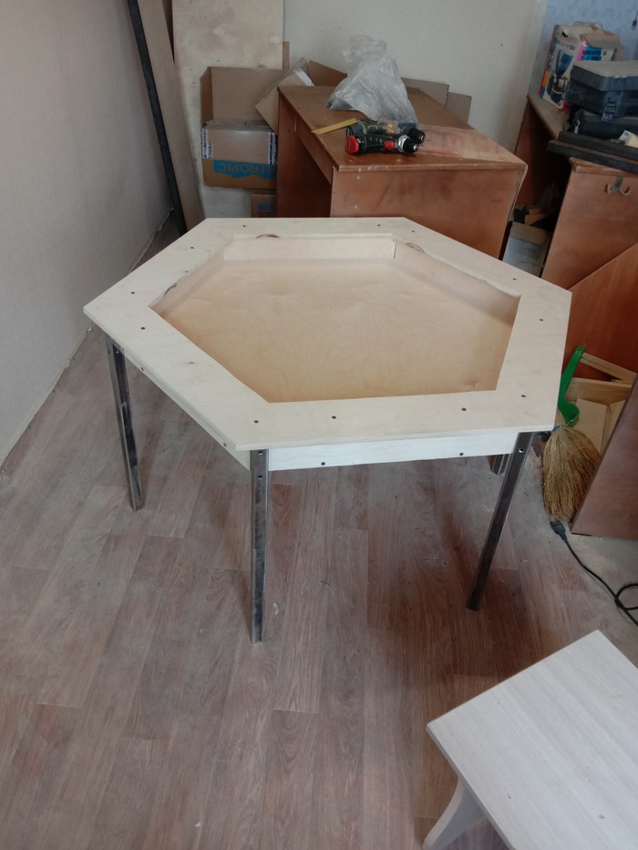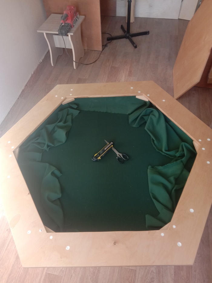 Что бы сейчас сделал иначе: ножки можно было сделать чуть длиннее, не критично, но всё же. Ткань нужно было брать потолще и клеить её до того, как собрал всё в кучу. Лишних дырок насверлил в ножках. Перебдел, будет уроком. В остальном, всё вышло отлично. Помещается любая игра с запасом. Широкие борта для планшетов игроков разгружают игровую поверхность. Плюс, если партия затягивается и доиграть нет сил, можно не убирать всё со стола, а просто накрыть крышкой и пользоваться полноценным столом. Очень удобная форма шестиугольника. Никому не мешаешь, локтями не толкаешься. В общем, одни только плюсы)