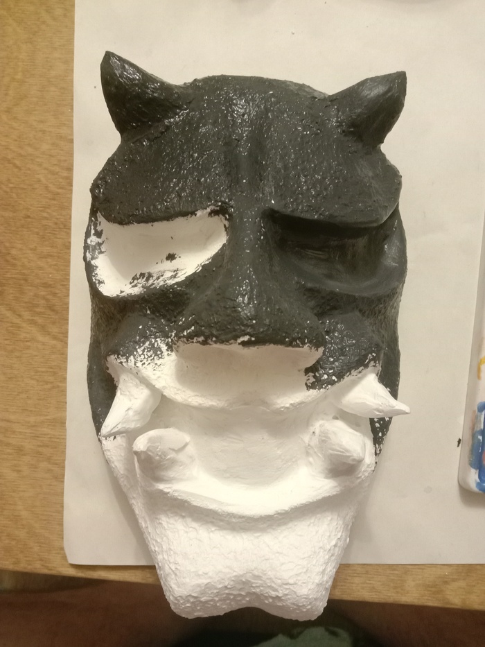 Тут уже появились зубы и рога, тоже из каши туалетной бумаги и ПВА. Далее покраска. Много много слоёв. Сперва пользовался акрилом, экспериментировал с цветом и глубиной, в общем, куча косяков и запоротых моментов. Покраска, в общем, не моё. На фото всё видно.