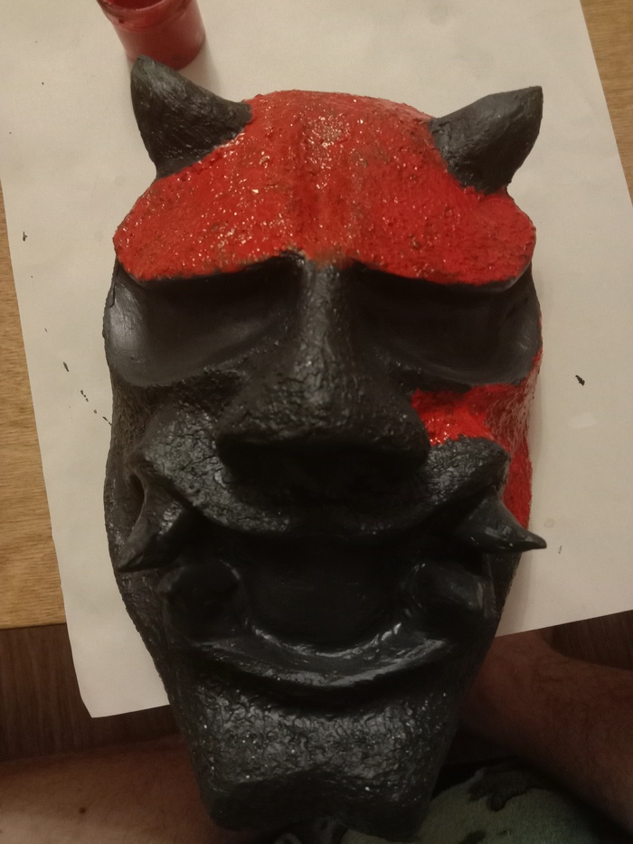 Этот слой покрыт акриловым глянцевым лаком на два слоя. По задумке, красный фот должен блестеть, а вот поверх него нужен черный матовый цвет. Акриловый черный давал глянец. Попробовал гуашь, цвет получился отлично, но она пачкалась. Покрыл всё простым матовым лаком, и вот у меня блестит вся маска. На фото не особо заметно, но вживую искрится сильно