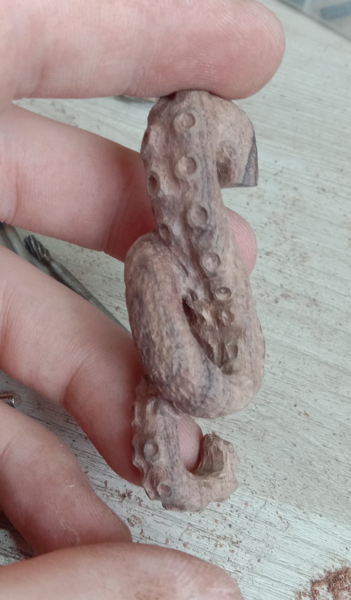 Процесс долгий и медитативный в какой-то степени. Понравилась текстура древесины, что оставалась после фрез. Такие не ровные щербинки, отдалённо похожие на чешую. Решил всю поверхность щупальца сделать щербатой.