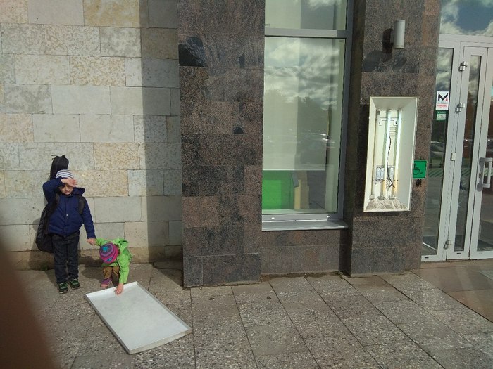 Это баннер сбербанка с подсветкой. Был. Легким порывом ветра, от которого еле колыхнулись волосы моей трёхлетней дочери его сорвало со стены и бросило на детей. Слава богу ветер действительно был небольшим, чуть-чуть не долетело. Как же я там пере*испугался.