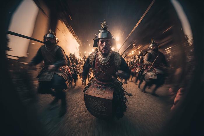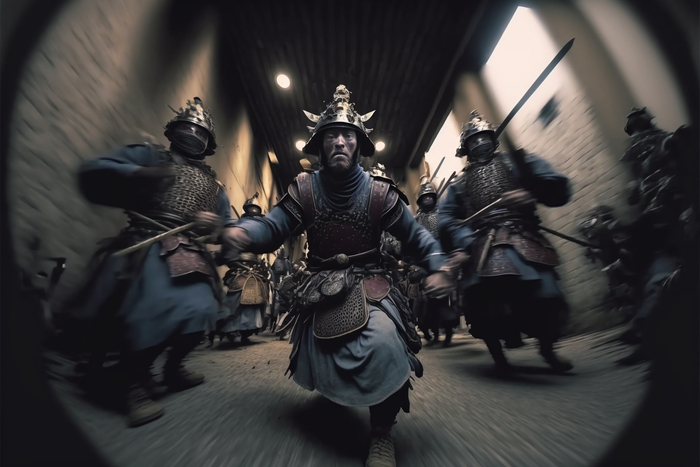 «soldiers run to the attack, selfie view, GoPro, fisheye, low lighting, shot on professional camera, cinematic lighting, soft lighting, 4k, 8k, intricate details, depth of field, photography, cinematic shot, cold tone --ar 3:2»
