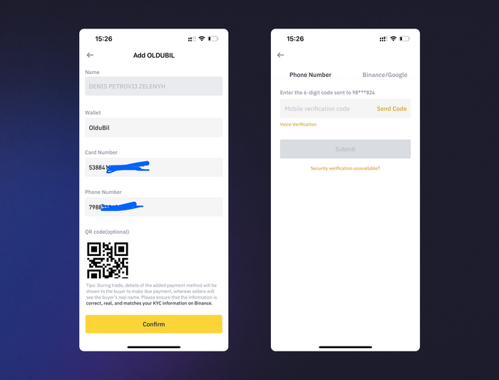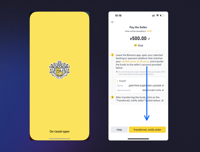 9. Скопировав номер карты необходимо перейти в приложение банка и отправить деньги простым переводом на указанные номер. После чего, необходимо вернуться в Binance и нажать кнопку «Отправлено, уведомить продавьца» (Transfered, notify seller).