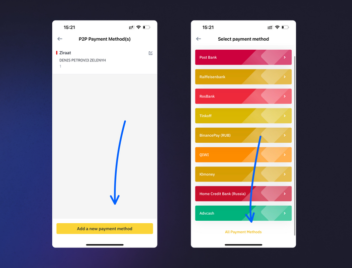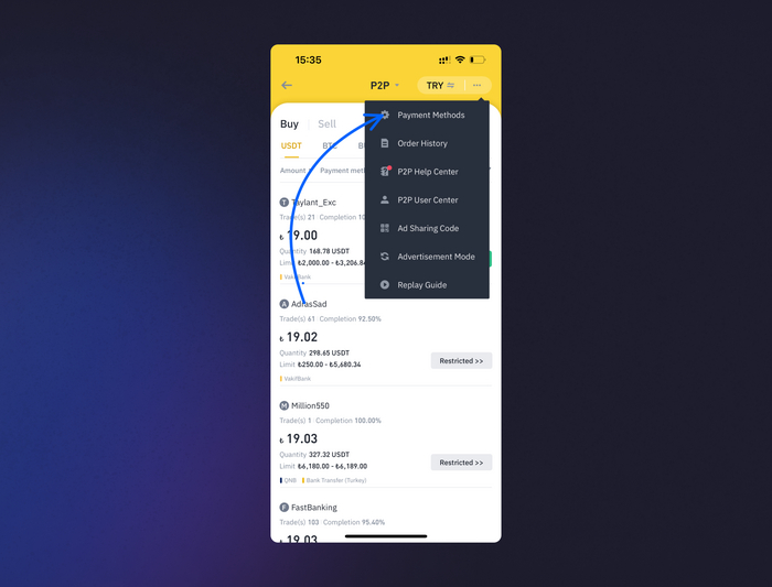 1. Находясь во вкладке P2P Trading необходимо нажать кнопку с тремя точками в верхнем правом углу. Откроется меню, в котором нужно нажать «Методы оплаты» (Payment methods).
