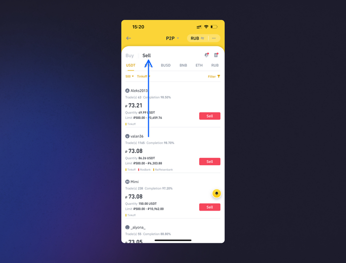 1. Находясь в разделе P2P Trading необходимо перейти из вкладки «Купить» (Buy) во вкладку «Продать» (Sell).