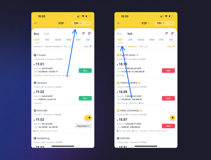 2. Находясь во вкладке «Продать», в верхней части экрана необходимо сменить валюту RUB на TRY.
