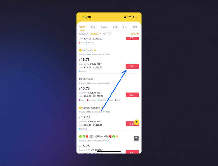 4. Бинанс подобрал офферы. Выбираем тот, что больше всего нравится. Нажимаем красную кнопку «Продать» (Sell).