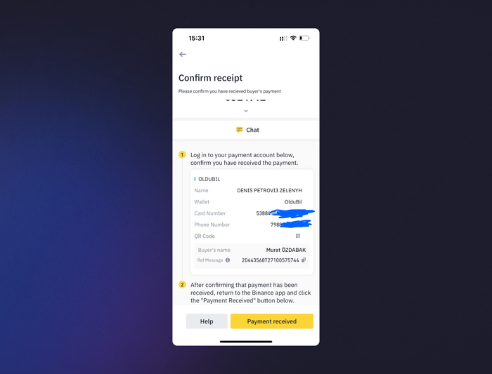 8. Проверяем данные и поступление денег в OlduBil, подтверждаем получение. Сначала нажав кнопку «Платеж получен» (Payment recived), после вводим код из СМС.