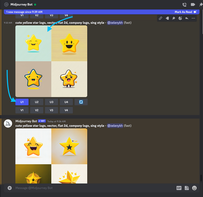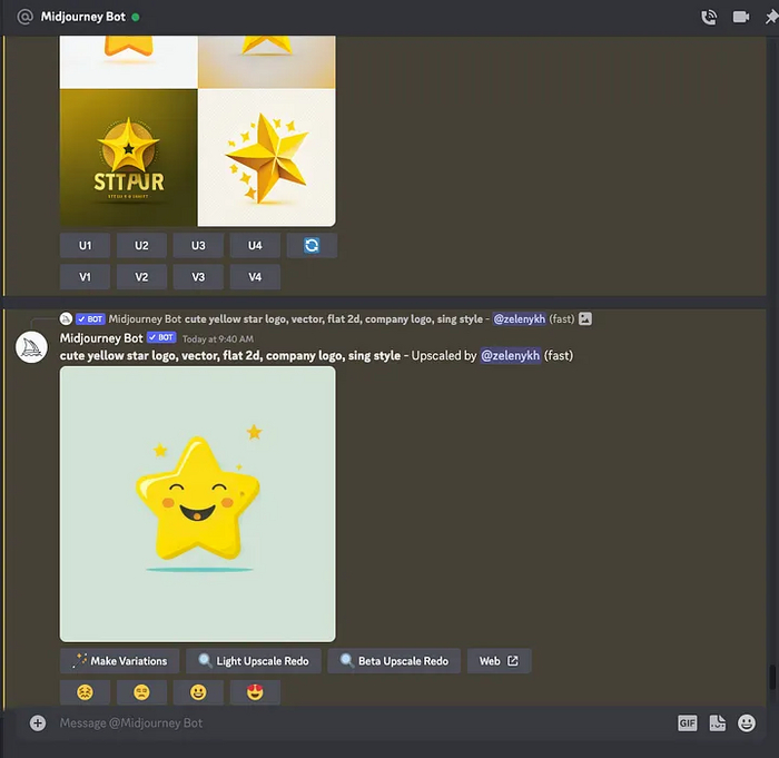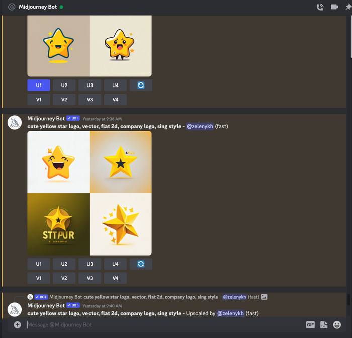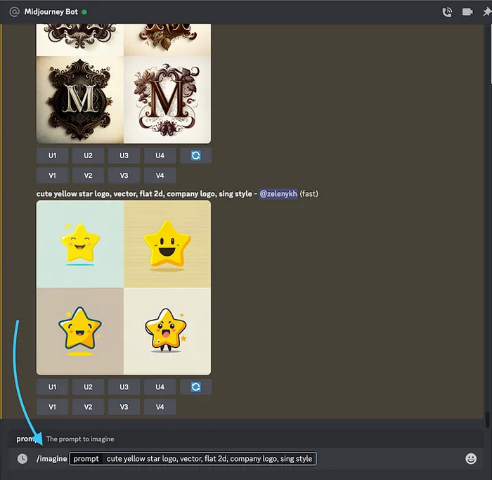 Итак, для того чтобы сгенерировать логотип в Midjourney необходимо вызвать команду «/imagine prompt» и далее написать что вы ходите получить, в формате: «cute yellow star logo, vector, flat 2d, company logo, sing style». Перед первой запятой описывается что должен изображать логотип, а далее его стилистику. Примеры стилей можно изучить в этом гайде.
